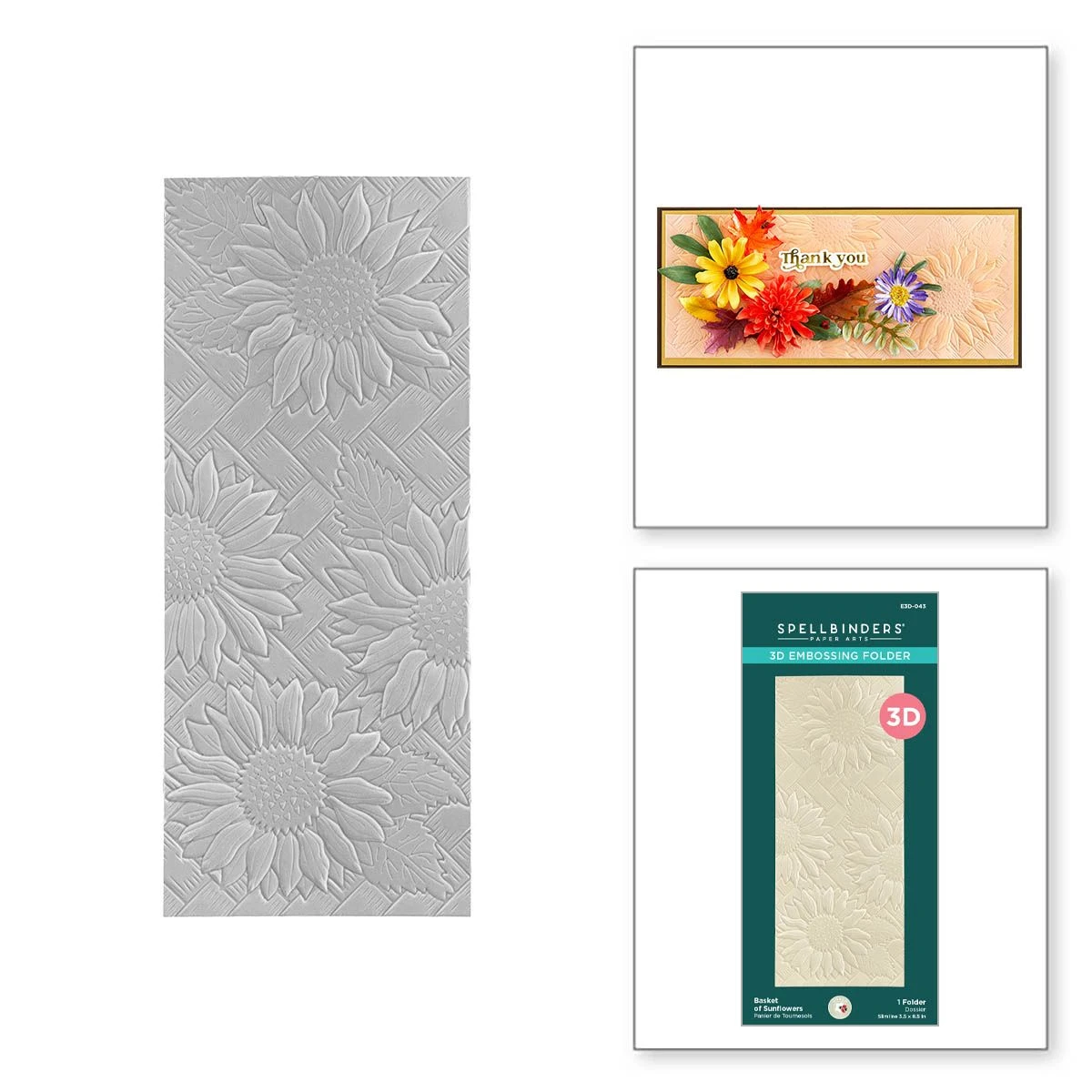 The Basket of Sunflowers 3D Embossing Folder is a delightful addition to the Birds & Bees Garden Collection by Susan Tierney-Cockburn. This unique embossing folder is designed to add texture and dimension to your creative projects. It can beautifully emboss a slimline card-sized surface measuring 3.5 x 8.5 inches, featuring sunflower blooms randomly placed against a charming basket weave background. This design creates the perfect backdrop for fall-themed projects.