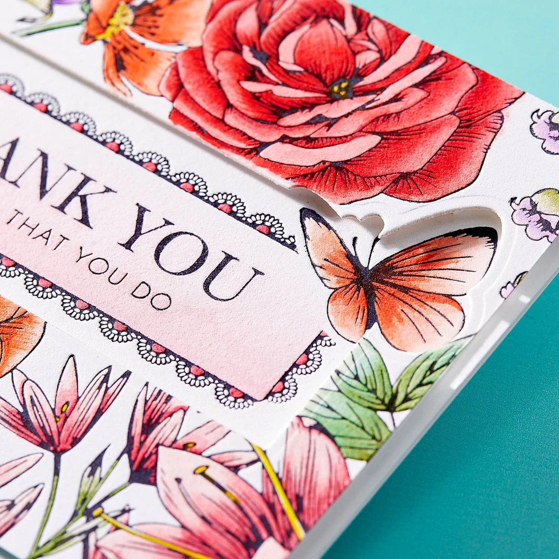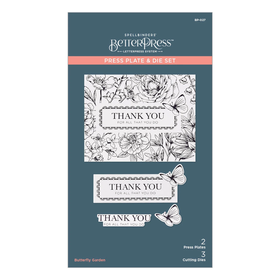 The Butterfly Garden Press Plate & Die Set is a part of the BetterPress Collection by Spellbinders. It features a beautiful A2-sized floral background design along with a framed thank you sentiment plate. The set includes three thin metal cutting dies that cut the sentiment in two ways – the entire plate with butterfly, the sentiment only, and a butterfly shape. To create a crisp letterpress design, simply ink the plate with BetterPress Ink and press it against the BetterPress Cotton Card Panel and Sheets.
