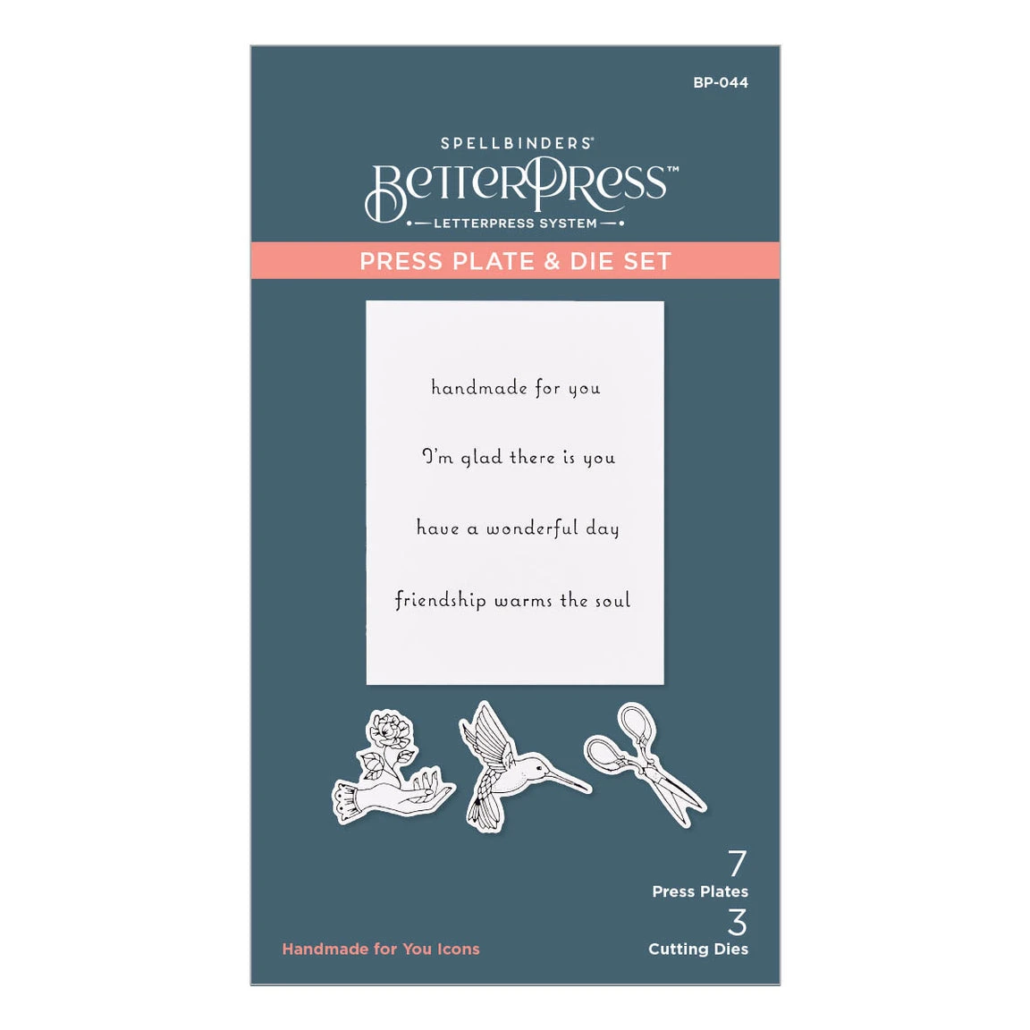 The Handmade for You Icons Press Plate and Die Set is a part of Spellbinders’ BetterPress Collection. It includes seven press plates, four of which feature friendship sentiments and three themed designs, as well as three thin metal cutting dies that cut the motifs into shapes. Use BetterPress Ink to ink the press plate and press it against the BetterPress Cotton Card Panel and Sheets to create a clean letterpress design.