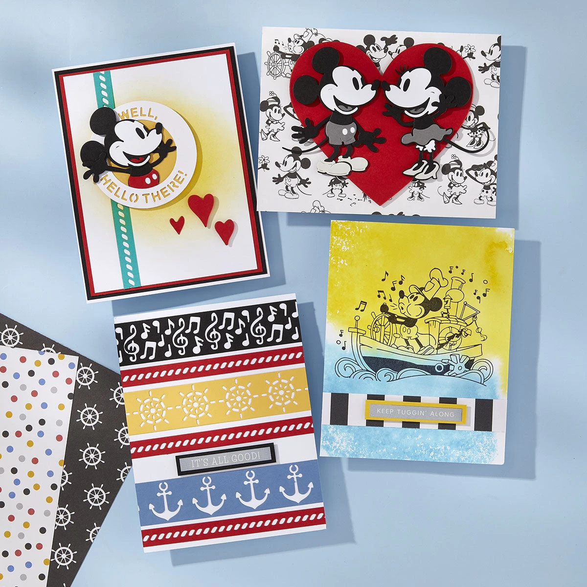 • Classic Mouse Borders Etched Dies (S5-704) – includes four border dies featuring repeating nautical and musical patterns inspired by Steamboat Willie. Each can be cut multiple times to extend the design. Wide Borders are approximately 6.00 x 1.00 inches / 15.2 x 2.5 cm.
