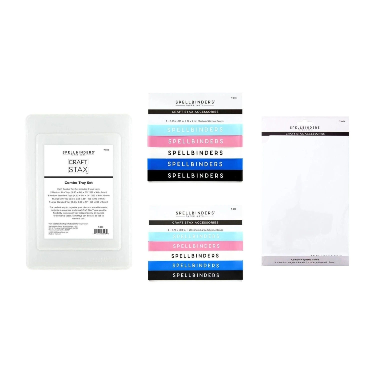 Spellbinders Craft Stax Combo Tray, Panel, Band Bundle combines Craft Stax Combo Tray Set T-055, Magnetic Panels Combo t-074, Medium Silicone Bands T-072, and Large Silicone Bands T-073, making it easy to keep your supplies tidy and accessible.