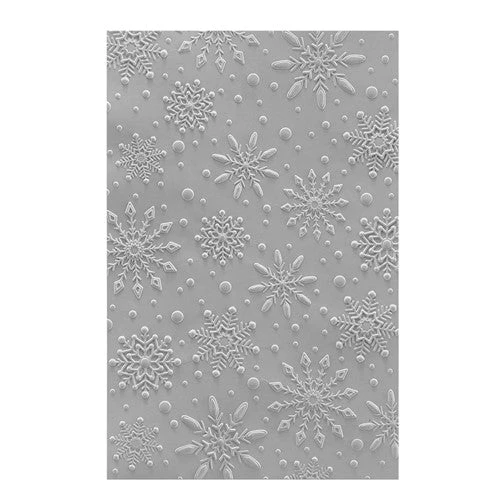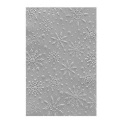 Flurry of Snowflakes 3D Embossing Folder is a 5.50 x 8.50-inch embossing folder that has different snowflake and dot designs in an all over pattern.