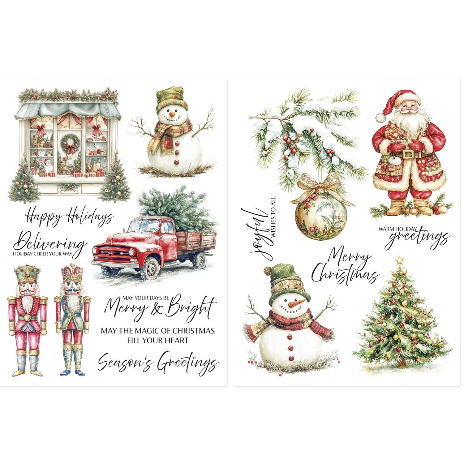 Spellbinders Joyful Wishes Rub-On Sheets are part of the Simply Made Collection. This festive illustrated set includes two 6 x 8-inch sheets of vibrant, high-quality rub-on transfers featuring 17 unique images and sentiments. Designs include snowmen in hats and scarves, nutcrackers, Santa Claus, decorated trees, a pickup truck carrying a tree, snowy pine branches with ornaments, and a cheerful holiday storefront. Sentiments include “Happy Holidays,” “Delivering holiday cheer your way,” “May your days be merry & bright,” “Season’s Greetings,” “joyful wishes to all,” “Merry Christmas,” and “Warm Holiday Greetings.” These rub-ons are ideal for adding a seamless, hand-drawn look to your scrapbook layouts, cards, and journals—making it easy to achieve polished, professional results with minimal effort.