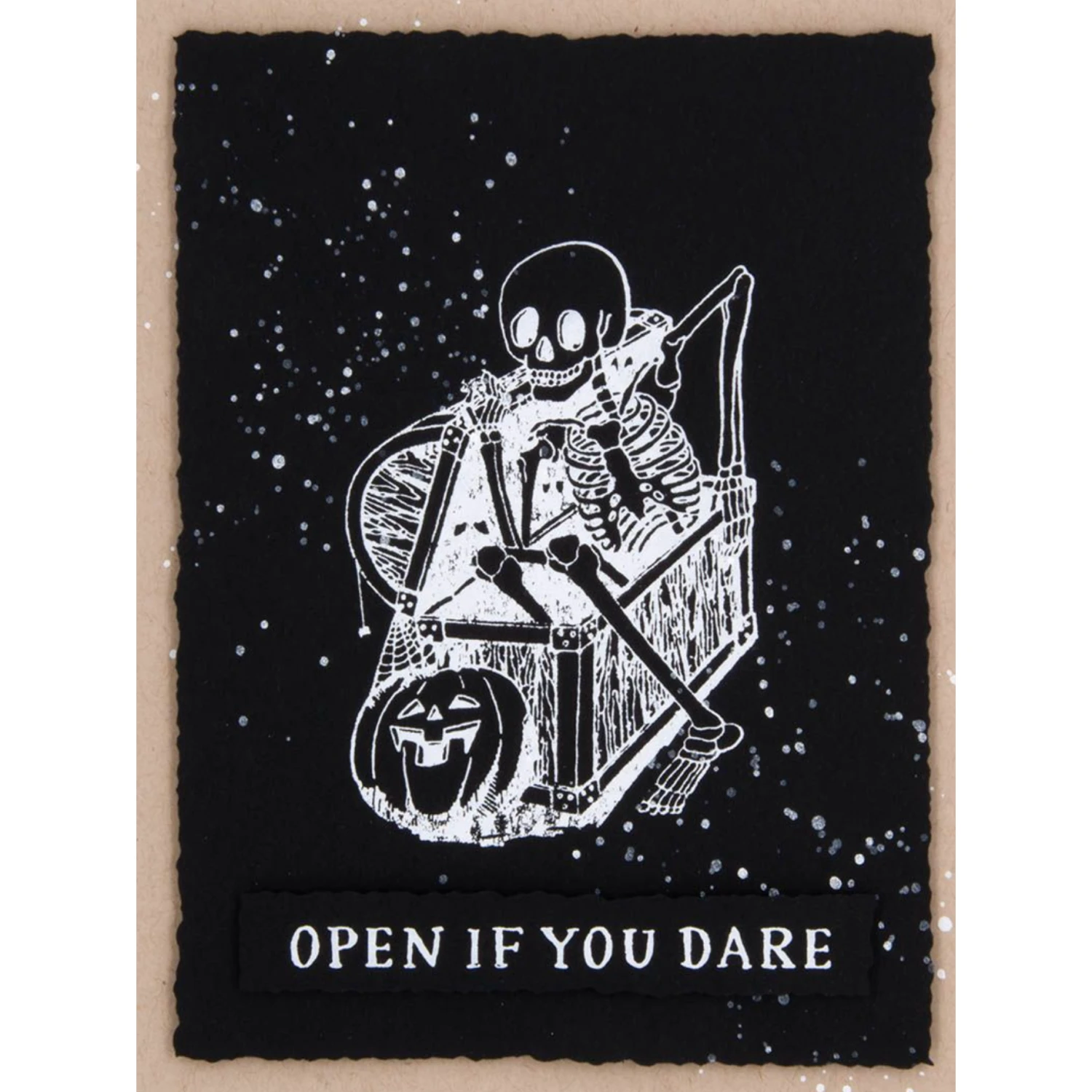 The Open if You Dare Press Plates form a captivating duo within the Spellbinders Betterpress Halloween Collection. This set comprises two plates, with the larger plate depicting a spooky skeleton emerging from a treasure box, accompanied by a pumpkin at its base. The second plate features the sentiment Open If You Dare, prompting an intriguing question—would you take the dare? The imaginative design captures the essence of Halloween mystery and excitement.