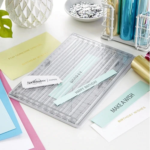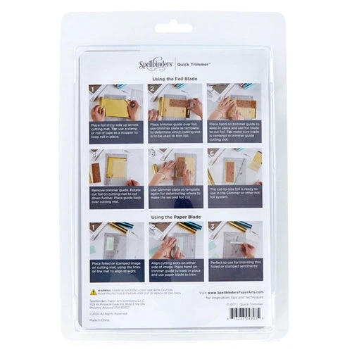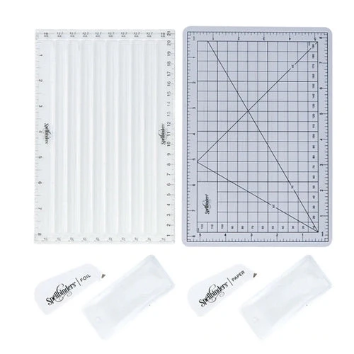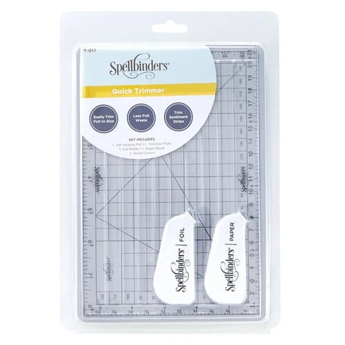 The Quick Trimmer is a versatile trimmer. It is perfect for trimming thin paper strips as in sentiment strips, and it easily cuts foil to size for the Spellbinders Glimmer Hot Foil System. It helps to reduce waste and doesn’t scratch the medium surface. The set includes one self-healing mat, one trimmer guide, two cutting blades and two cutting blade sleeves. The mat and guide are in both measuring systems, inches and centimeters. Replacement blades are available as T-018 Quick Trimmer Replacement Blades. To cut, sandwich the foil or paper between the self-healing mat and trimmer guide, determine where to cut, place the blade down into the channel, and glide your blade to cut the material.