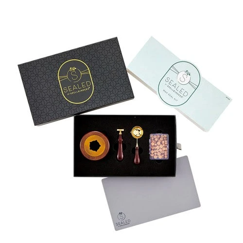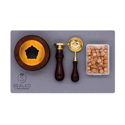 The Wax Seal Kit is part of the Sealed by Spellbinders Collection and contains five pieces to get you started on your stationery journey. It includes a wax warmer, a wax bead warmer spoon, one wax seal stamp with handle, 100 wax beads and a 10 x 7-inch silicone mat to protect your surface. For other choices of wax bead colors and wax seal stamp designs, look to Spellbinders’ offerings in this collection.
