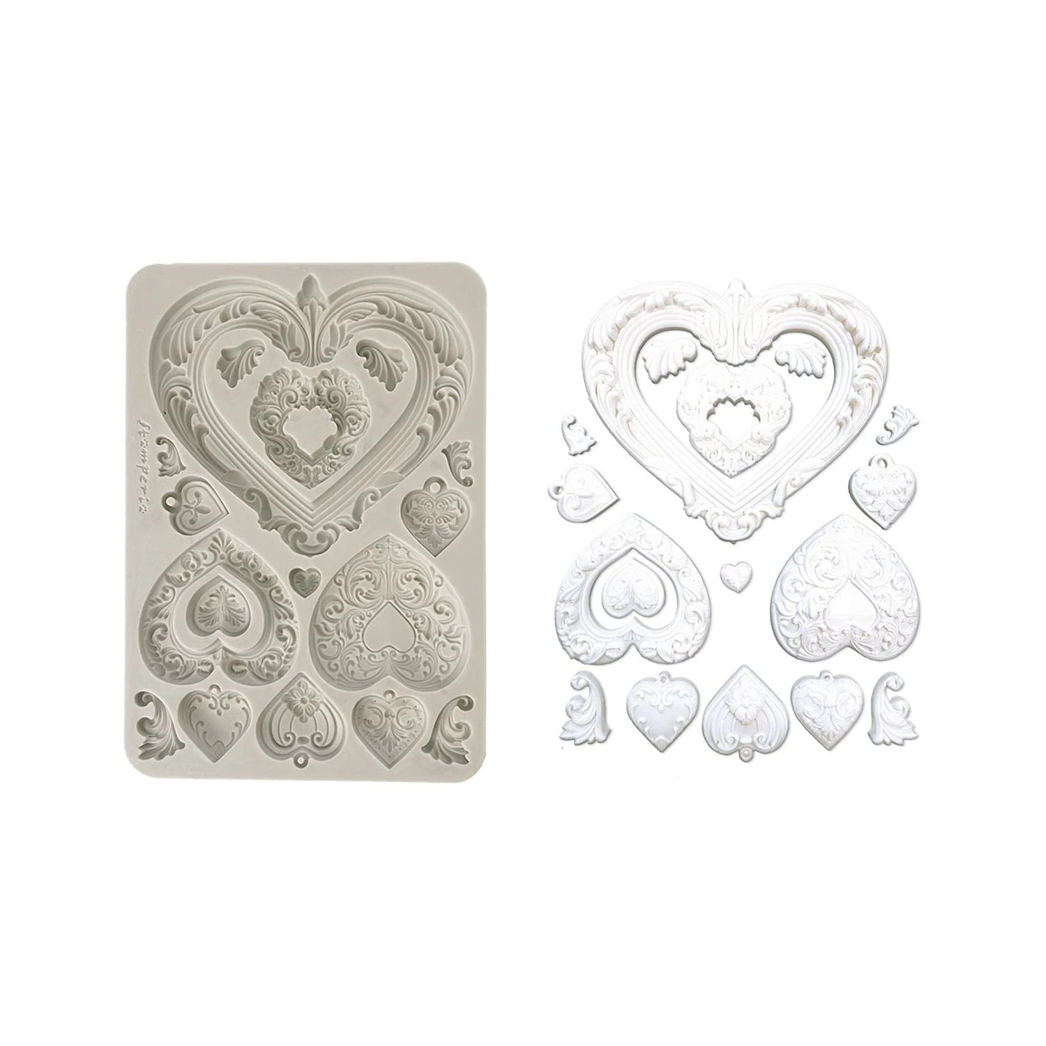 Stamperia Hearts Silicone Mold is a versatile soft mold ideal for use with materials like soft clay, resin, and more. Simply fill the mold, let it dry, and then remove the detailed shapes with ease. Perfect for paper and mixed media projects, the mold features 17 designs on an approximately 8 x 11-inch surface. The designs include ornate open and closed hearts adorned with flourishes, with some featuring loops to be easily transformed into charms. Additionally, the mold includes elegant flourished accent pieces, making it a beautiful and functional addition to any creative project.