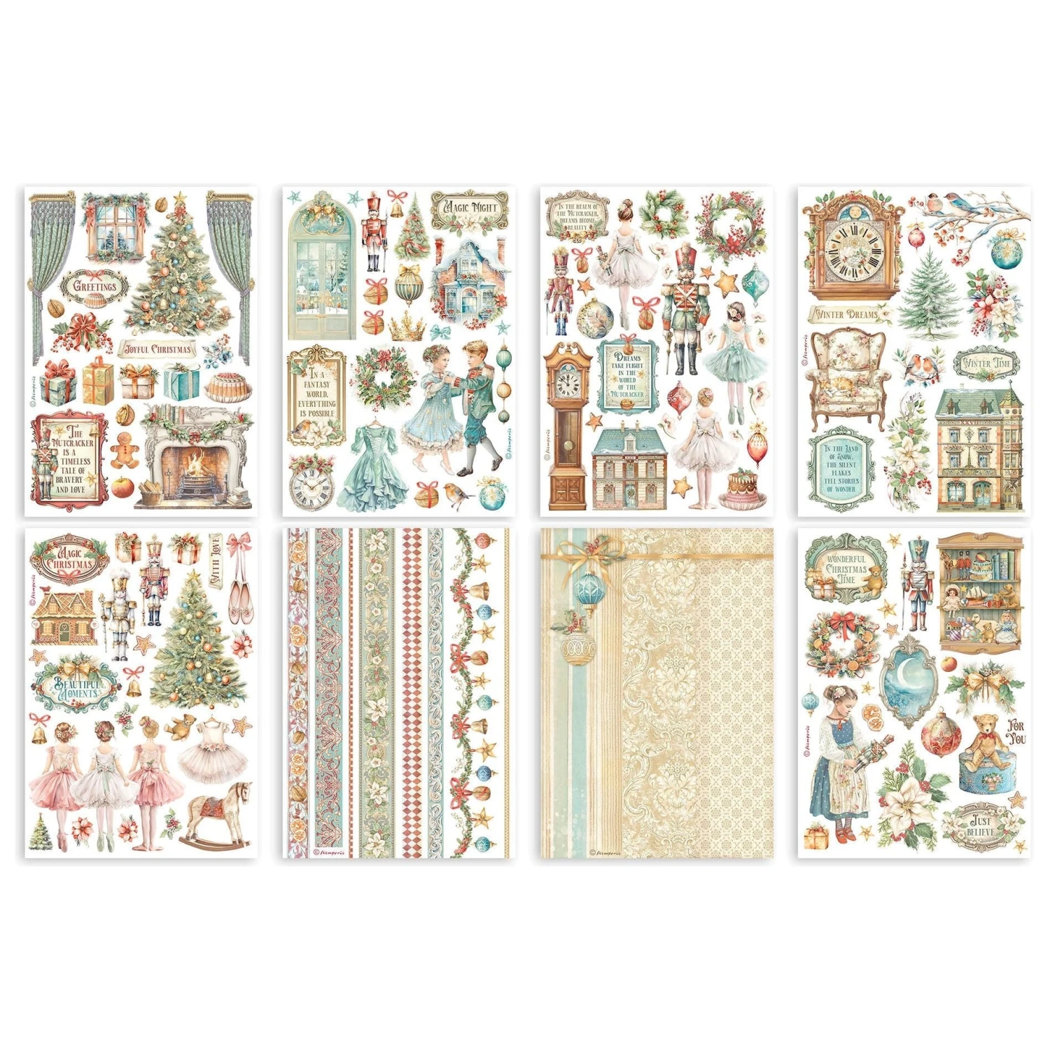 Stamperia The Nutcracker Collection has recreated the atmosphere, characters, and cherished objects that have remained in the collective memory for many generations. This washi pad includes 8 sheets of translucent washi paper, each in A5 size (approximately 5.8 x 8.3 inches). These versatile sheets are easily cut with the ceramic cutter pen krt17 and are best suited for use on light surfaces. The designs feature Victorian children, clocks, fireplaces, flowers, wreaths, windows, curtains, gingerbread, desserts, ballet dancers, nutcrackers, ballet shoes, houses, borders, wallpaper prints, vintage toys, and labels with sentiments such as “Greetings,” “Joyful Christmas,” “Beautiful Moments,” and more. This collection is perfect for adding a nostalgic and magical touch to your holiday crafting projects.
