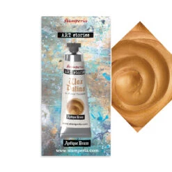 Stamperia Wax Patina Antique Brass is part of the Art Stories Collection. This water-based paste adds a striking metallic finish to any surface, making it perfect for highlighting textures and details in your mixed media, home décor, or craft projects. ntique Brass is a deep golden hue with a luminous metallic sheen. Tube contains approximately 40 ml.