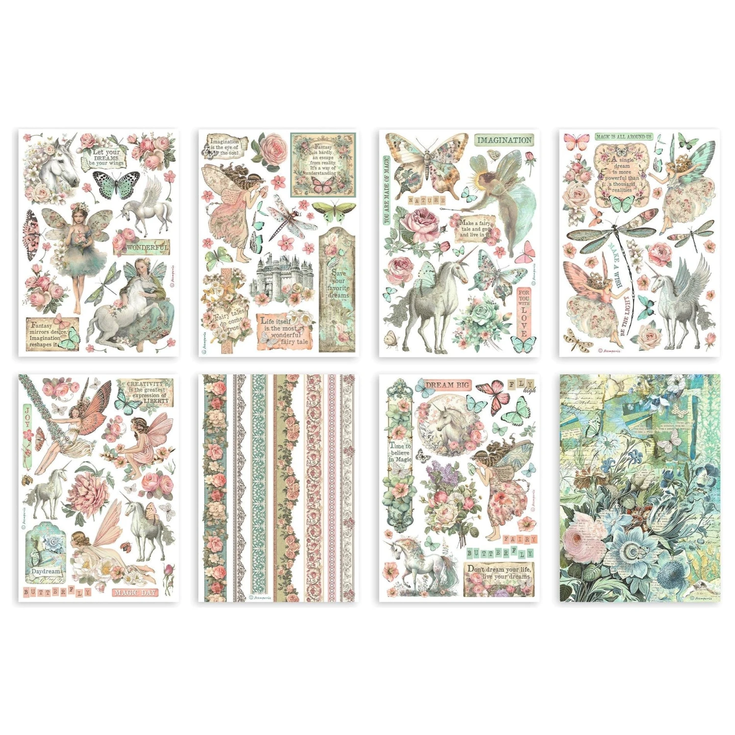 Wonderland is a magical and dreamy collection that brings you into a fantasy world against waves of blue and pink to create a canvas for your projects. This washi pad includes 8 sheets of translucent washi paper, each in A5 size (approximately 5.8 x 8.3 inches). These versatile sheets are easily cut with the ceramic cutter pen krt17 and are best suited for use on light surfaces. Designs within the pad include enchanting elements such as fairies, butterflies, unicorns, dragonflies, flowers, borders, a castle, and labels adorned with inspiring phrases. Sentiments found on the labels include “Imagination is the eye of the soul,” “Let your dreams be your wings,” “Fantasy mirrors desire. Imagination Shapes it,” “Magic Day,” “Don’t dream your life, live your life,” “Magic is all around us,” and more. These sentiments add an extra layer of whimsy and inspiration to your projects.