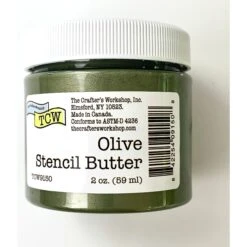 The Crafter’s Workshop Stencil Butter is a creamy medium with a shimmering shine that spreads easily with a palette knife. It possesses the body of a soft modeling paste, retaining its peaks and valleys for texture. Cleanup is easy with water, rinse tools immediately after use. This versatile medium is perfect for various techniques, including stenciling, finger-painting, and brush-painting. The colors blend harmoniously with each other, as well as with Metallic Pastes. Depending on thickness, it dries in 15-30 minutes and is suitable for use on various surfaces such as watercolor paper, mixed media boards, canvas, wood, and more. This jar contains approximately 2 ounces of Olive, a deep army green.