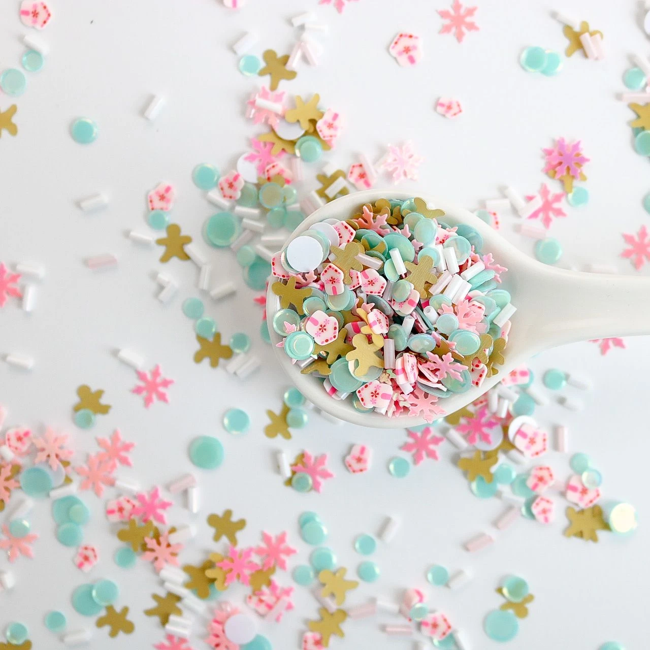 Elevate your holiday shaker cards with This Calls For Confetti Gingerbread Bliss. This mix is tailor-made for the festive season, featuring an enchanting assortment of polymer clay pink gingerbread houses, gingerbread-shaped sequins in a charming matte tan hue, and soft Island Blue sequins to infuse an extra pop of color. Completing the mix are pink snowflakes and pastel bugles, adding a delightful touch. Each pack contains a plentiful 1 tablespoon of this festive blend, simplifying the task of crafting multiple cards with just one purchase. Prepare to spread holiday cheer with Gingerbread Bliss and make your projects truly magical!