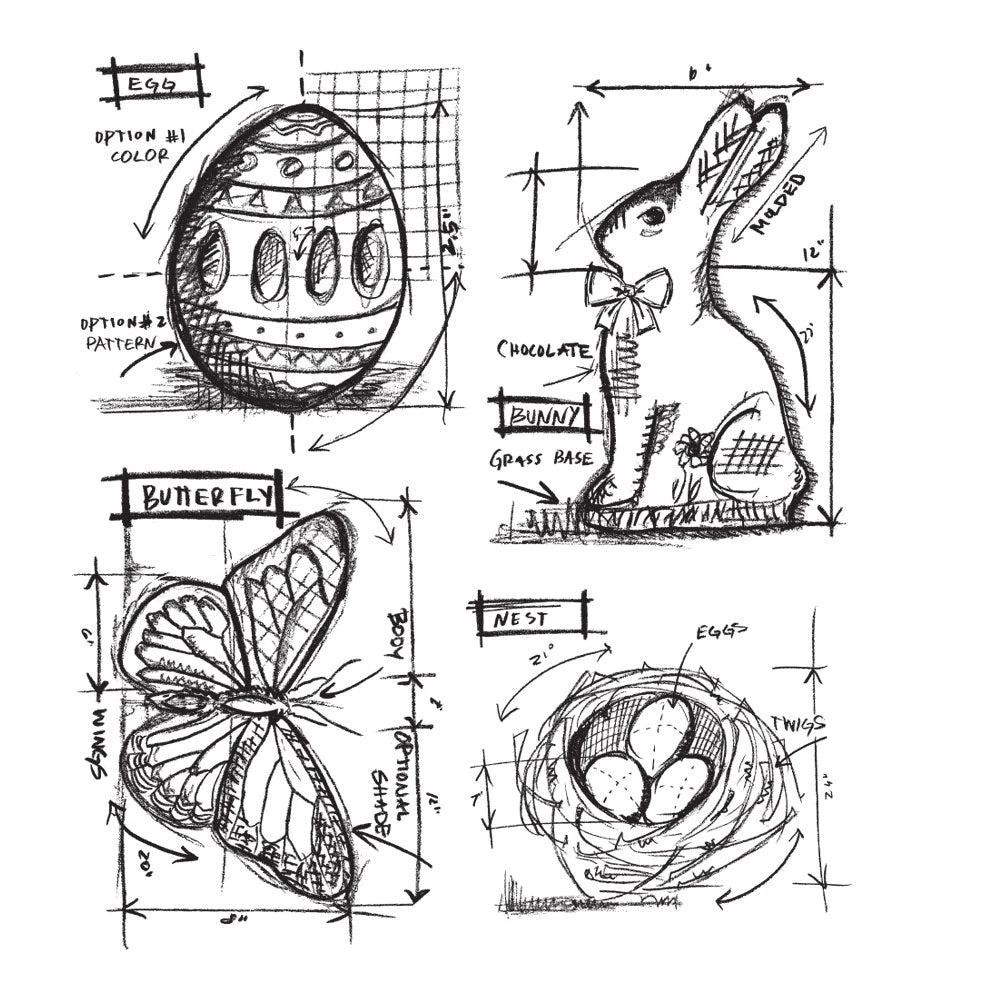 Measuring approximately 7 x 8.5 inches, this set features 4 different deeply etched red rubber cling stamps. Blueprint images of an Easter Egg, Chocolate Rabbit, Butterfly, and Bird’s nest.