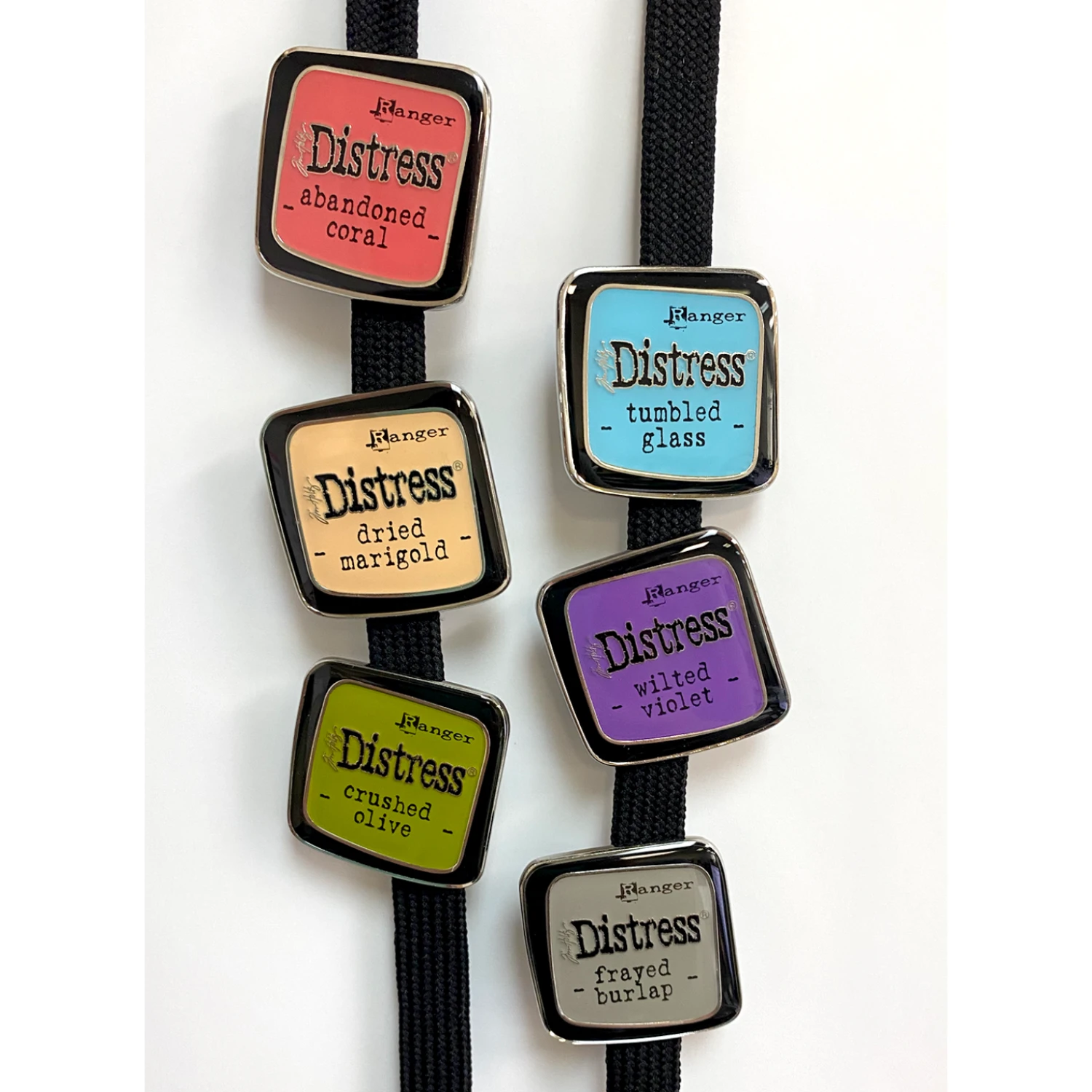The iconic Tim Holtz Distress Ink Pads are now available in collectable mini Enamel Pins! Distress Enamels Pins are inspired by the styling of the original ink pads, with a graphic flair. These custom pins are created in your favorite colors of Distress, engraved in silver metallic and layered with a smooth, shiny finish. Distress Enamel Pins are released in sets of 6 colors.