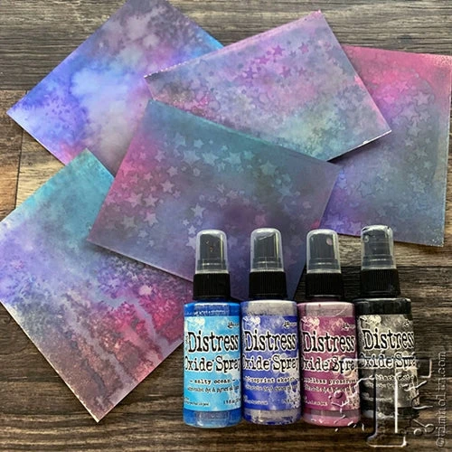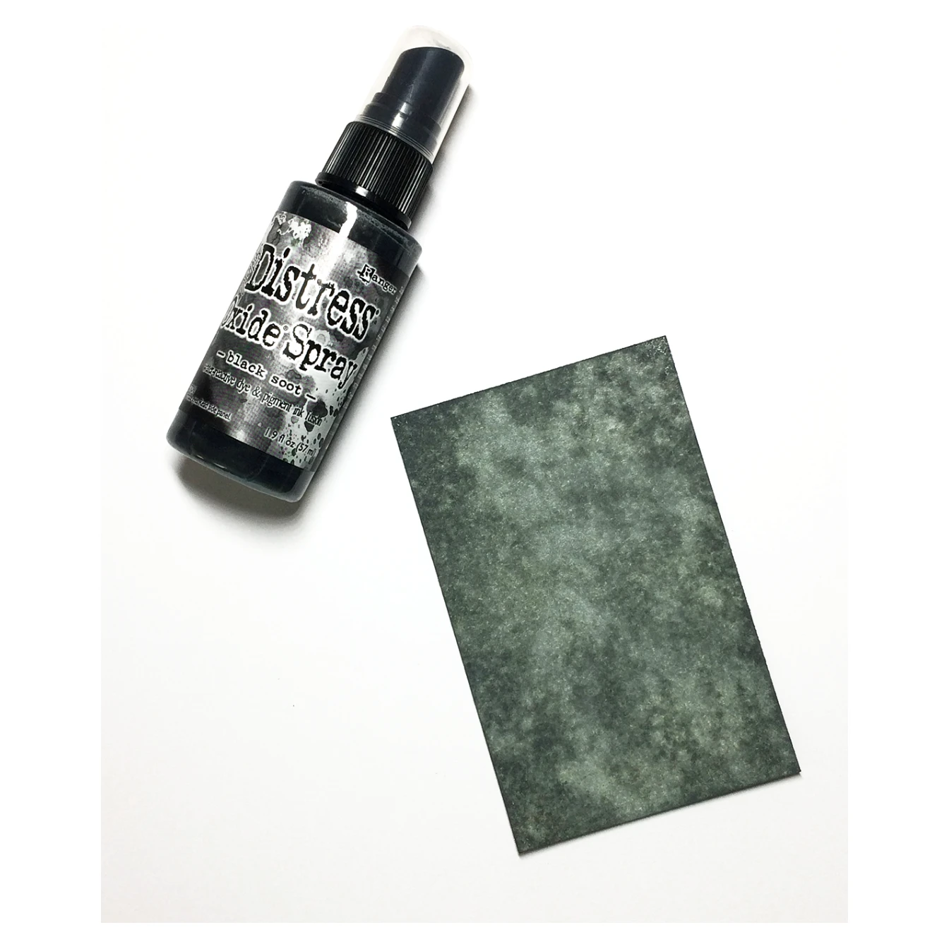 Tim Holtz Distress Oxide Spray is a dye and pigment ink fusion that creates oxidized effects when sprayed with water. Use for quick and easy ink coverage on porous surfaces. Spray through stencils, layer colors, spritz with water and watch the color mix and blend.