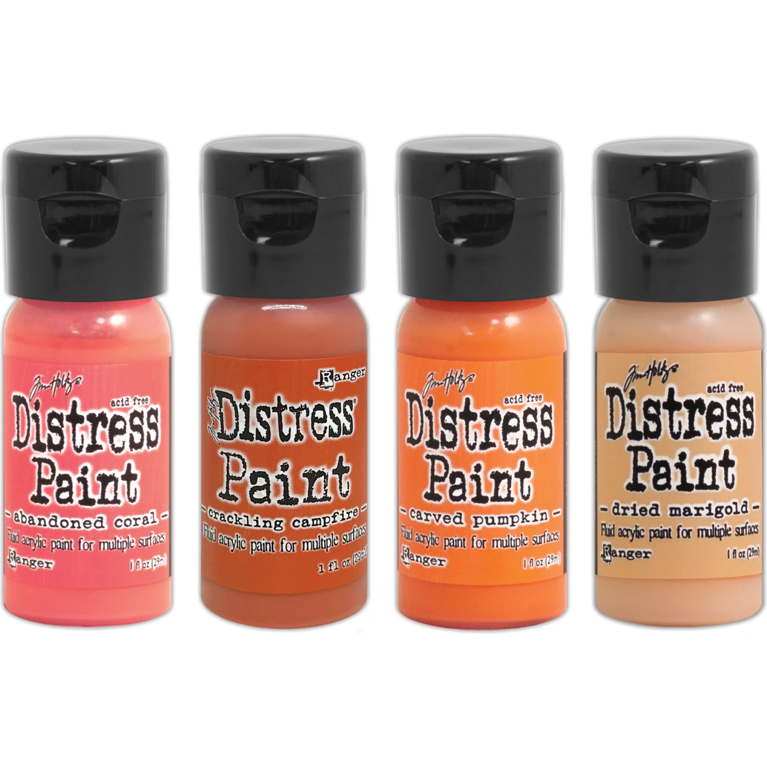 The Tim Holtz Flip Top Distress Paint Foursome Bundle 2 by Ranger is a must-have for any art enthusiast! This kit includes four vibrant colors: Abandoned Coral, Carved Pumpkin, Crackling Campfire, Dried Marigold. The convenient flip tops allow for quick and easy application of the Distress Paints with brushes, blending tools, splatter brushes, and more.