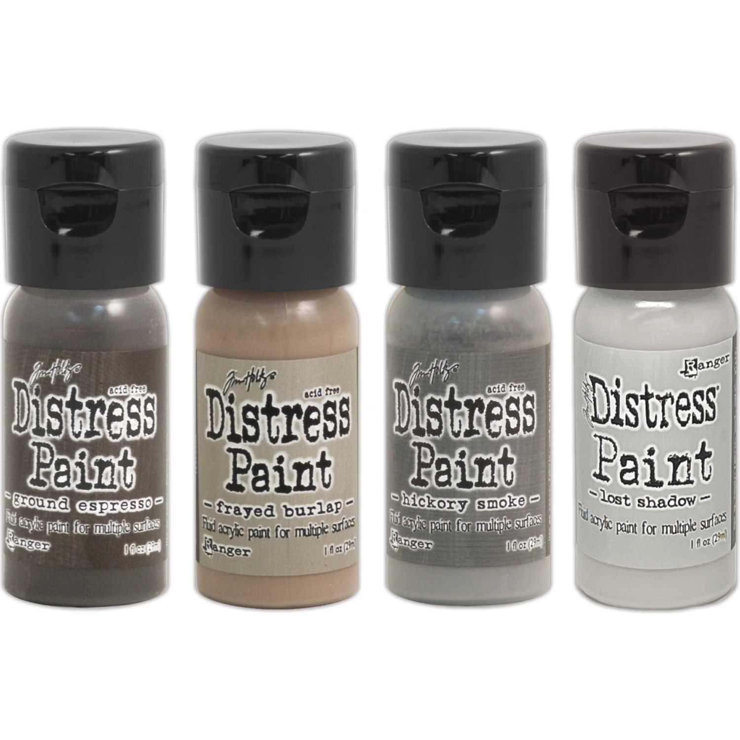The Tim Holtz Flip Top Distress Paint Foursome Bundle 7 by Ranger is a must-have for any art enthusiast! This kit includes four vibrant colors: Frayed Burlap, Ground Espresso, Hickory Smoke, Lost Shadow. The convenient flip tops allow for quick and easy application of the Distress Paints with brushes, blending tools, splatter brushes, and more.