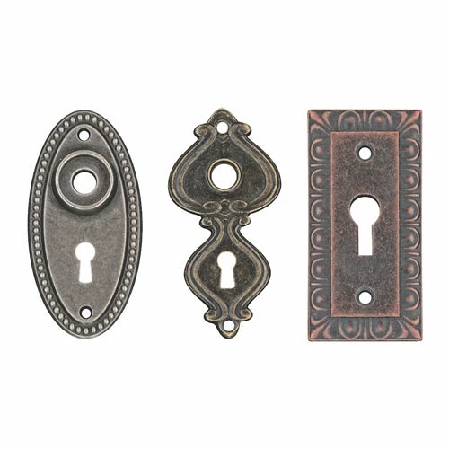 3 keyholes with antique finishes (1 nickel, 1 brass, and 1 copper).