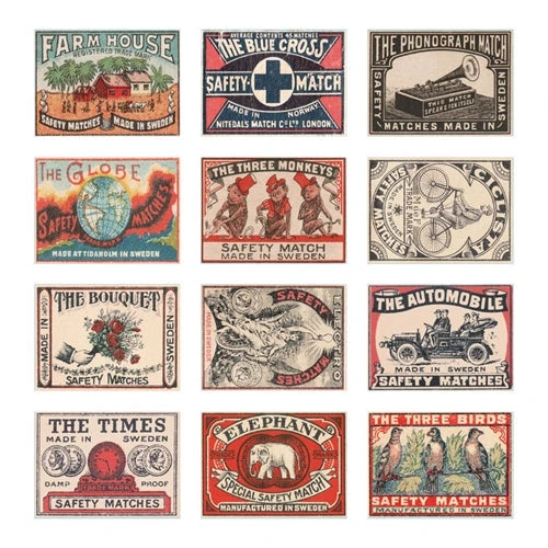 Two-piece paper boxes that slide to open. Include 6 matchboxes and 12 labels. Boxes are approx. 2 x 1.5 x 0.75 inches each.
