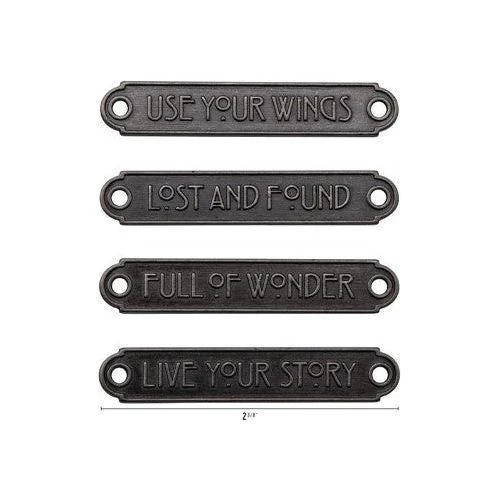 Tim Holtz Word Plaques are metal labels that feature unique raised words on each. Simply adhere or use Tim Holtz fasteners for an expressive label on your next make.