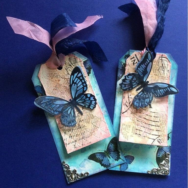 These tag shaped stencils can be used to layer with inks, stains, paints, and more!