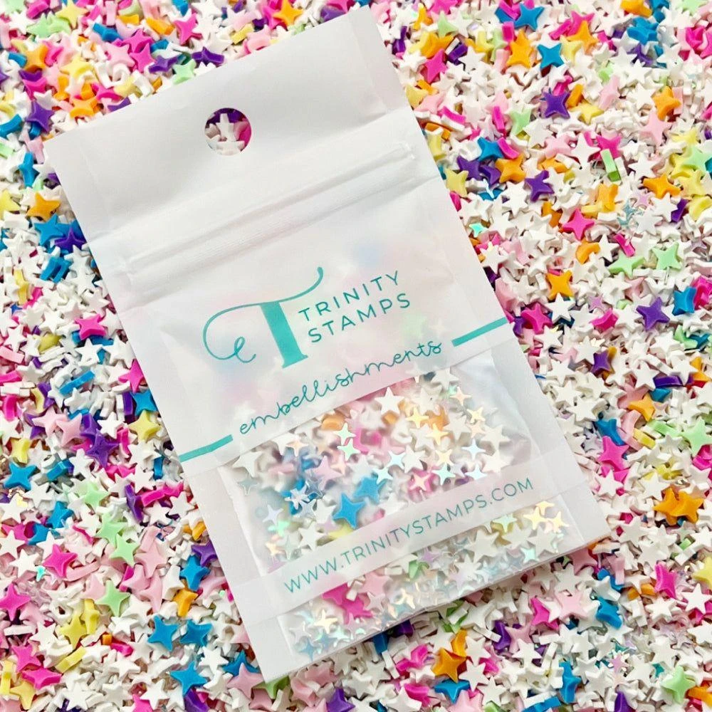 This embellishment mix contains a combination of clay and confetti stars in various star shapes, packaged in a resealable zip top bag with a total of 2 teaspoons.