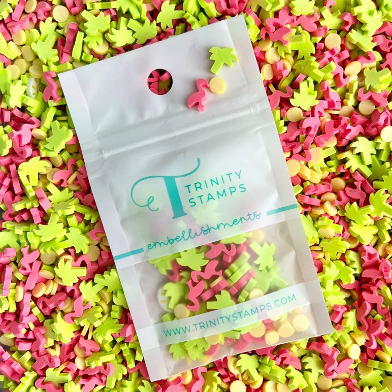 Bring a tropical flair to your crafts with Trinity Stamps Palm Springs Embellishment Mix! This vibrant mix includes 10mm palm trees, flamingos, and 5mm yellow circle clay confetti, perfect for adding a fun and sunny touch to any project. Each package contains approximately 2 teaspoons of these delightful embellishments, all conveniently stored in a resealable zip-top bag for easy use and storage.