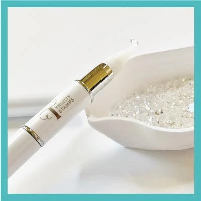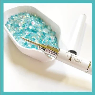 This little 3-D printed tray measures 4 inches long x 2 inches wide x 0.625 inch tall. You can dump out your embellishments into this tray to select what you want to use. When your done, the funnel end helps you easily put the leftover embellishments back into your Trinity Stamps embellishment box.
