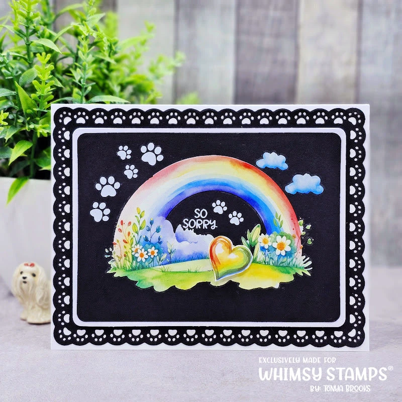 The Whimsy Stamps Rainbow Bridge Cat Rub Ons offer a heartfelt and time-saving way to decorate your projects. This set includes two 5×7 sheets of image transfers: one with black text and full-color images and the other with white text and full-color images. The designs feature rainbows, hearts, paw prints, sentiments, and angel wings, making them perfect for memorializing a beloved feline companion.