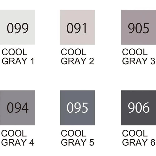 Brush tip makes it easy to create both narrow and wide lines. A six color set of gray color tones ideal for sketching, drawing, manga, graphic design, and more. Since colors of similar color tone have been specifically chosen, you can easily express shadows and gradiations beautifully. This six pack contains the following colors: 099 Cool Gray 1, 091 Cool Gray 2, 905 Cool Gray 3, 094 Cool Gray 4, 095 Cool Gray 5, and 906 Cool Gray 6